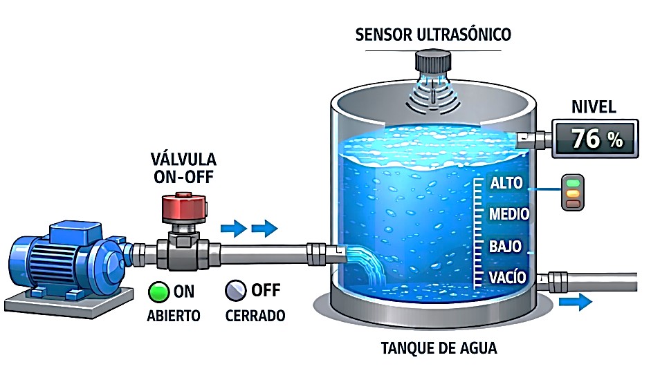 Gracias a un sensor ultrasónico que mide cuánta agua hay en el tanque sin necesidad de tocarla, solo usando ondas de sonido. Si el nivel está bajo, el PLC, que es el “cerebro” del sistema, le da la orden a la válvula para que se abra y entre más agua y, si está alto, le da la orden a la válvula para que se cierre y apaga la bomba.