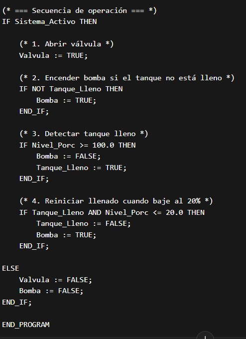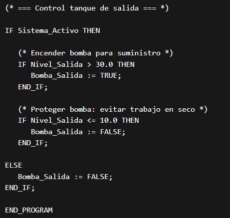 A continuación, se presenta un código de ejemplo para el control de la bomba de entrada en el tanque de agua cruda.