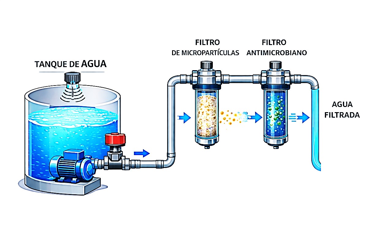 Después de pasar el agua por el equipo de ozono, el agua ya sale completamente desinfectada, sin bacterias, sin olores y sin contaminantes biológicos. En ese punto está lista para almacenarse y usarse con seguridad.