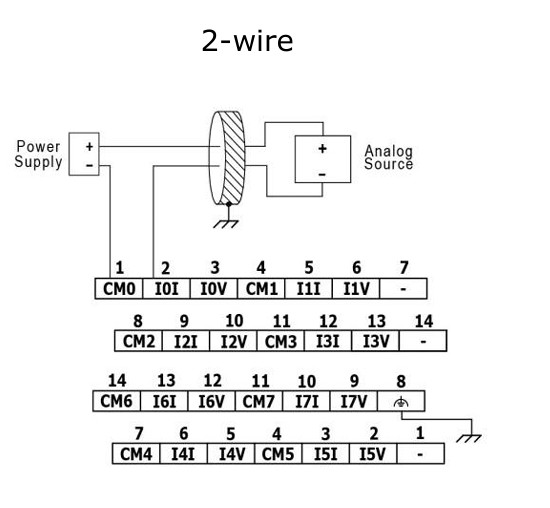 Un sensor de nivel con salida 4-20 mA se conecta a un módulo de entradas analógicas siguiendo el principio de lazo de corriente (loop), como se muestra en el esquema anterior tipo 2-wire. En este tipo de conexión, el sensor no envía voltaje, sino una corriente proporcional al nivel medido, por lo que debe instalarse en serie con el circuito.