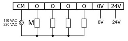 En la figura anterior se muestra un módulo de salidas a relé de un PLC. En el terminal común (CM) se conecta la fase de la red que se desea conmutar. Allí se puede inyectar 110 V o 220V AC, dependiendo del voltaje de la bobina del contactor o de la carga que se va a controlar. Ese voltaje queda disponible internamente para todas las salidas.