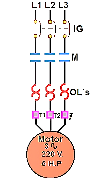 Este diagrama muestra el circuito de potencia típico para alimentar un motor trifásico; en este caso serían las bombas. La energía entra por las líneas L1, L2 y L3. Primero pasa por el interruptor general IG que permite conectar o desconectar manualmente todo el sistema.