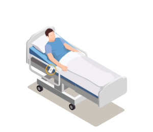El botón inalámbrico se conecta a la cama. El paciente presiona el botón para asistencia.